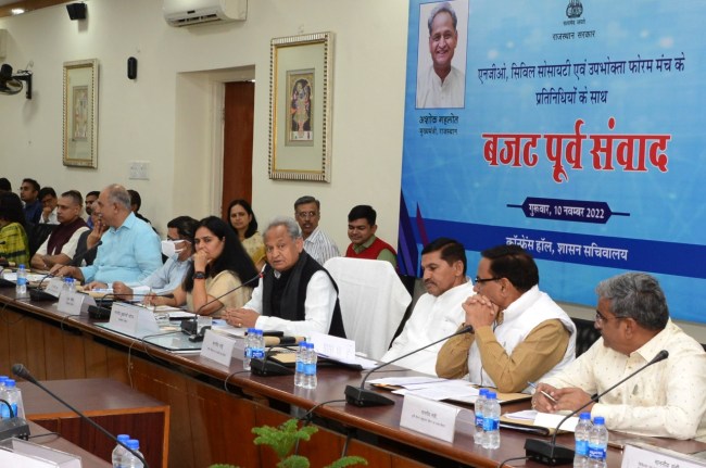 Rajasthan Budget 2023-24: अगले साल गहलोत सरकार अपना अंतरिम बजट लेकर आएगी, इसके लिए सरकार ने अभी से विचार-विमर्श और बजट के लिए सलाह लेनी शुरू कर दी है। नवंबर महीने में सीएम अशोक गहलोत ने पहली प्री-बजट बैठक ली। सचिवालय में स्वयंसेवी संगठनों, सिविल सोसायटी तथा उपभोक्ता फोरम के प्रतिनिधियों के साथ बजट पूर्व संवाद को संबोधित किया।