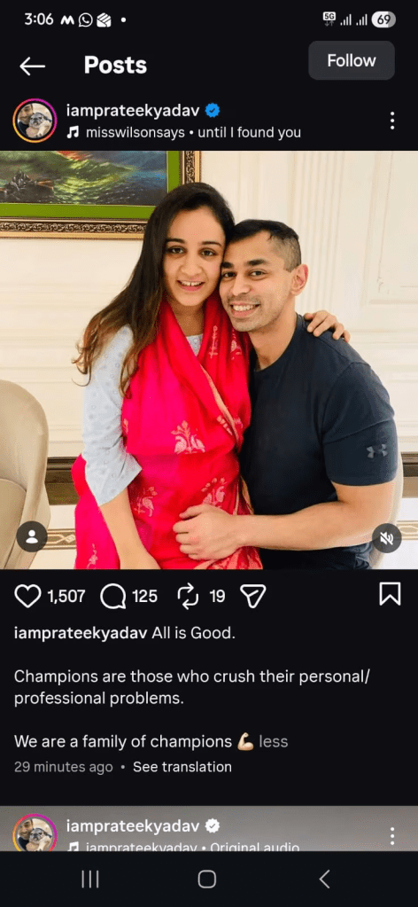 उत्तर प्रदेश के पूर्व मुख्यमंत्री अखिलेश यादव के छोटे भाई प्रतीक यादव ने कुछ दिनों पहले एक्स पर एक पोस्ट शेयर कर सभी को हैरान कर दिया था. प्रतीक ने पोस्ट में अपनी पत्नी और बीजेपी ने अपर्णा यादव की फोटो शेयर कर लिखा कि वो अपनी पत्नी से तलाक लेने जा रहे हैं. इस खबर ने ना सिर्फ सोशल मीडिया पर बल्कि राजनीतिक गलियारों में भी हलचल मचा दी थी. अब प्रतीक यादव का लेटेस्ट इंस्टाग्राम पोस्ट फिर से चर्चा में है. इस पोस्ट में उन्हें अपनी पत्नी अपर्णा यादव के साथ देखा जा सकता है और कैप्शन में लिखा है- ‘ऑल इज गुड’.