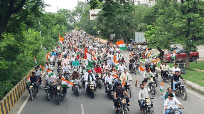 Greater Noida News: ग्रेटर नोएडा में किसानों ने बुधवार को तिरंगा यात्रा निकाली। जीरो प्वाइंट से शुरू होकर कासना होते हुए यह यात्रा रामपुर के सिरसा टोल पर समाप्त हुई। इस दौरान सैकड़ों की संख्या में किसान बाइक से रैली निकालते हुए नजर आए। किसानों ने यातायात व्यवस्था को ध्यान में रखते हुए यह यात्रा निकाली। किसानों का कहना है कि तिरंगा यात्रा निकाल कर उन्होंने देशभक्ति और एकजुटता का संदेश दिया है।