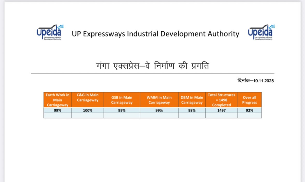 рдЧрдВрдЧрд╛ рдПрдХреНрд╕рдкреНрд░реЗрд╕ рдкрд░ рд╡рд╛рд╣рдиреЛрдВ рдХреА рдЕрдзрд┐рдХрддрдо рд╕реНрдкреАрдб 100 рд╕реЗ 120 рдХрд┐рд▓реЛрдореАрдЯрд░ рддрдп рдХреА рдЬрд╛ рд╕рдХрддреА рд╣реИ, рдЗрд╕ рд╣рд┐рд╕рд╛рдм рд╕реЗ рдореЗрд░рда рд╕реЗ рдкреНрд░рдпрд╛рдЧрд░рд╛рдЬ рдХреА рджреВрд░реА рдЫрд╣ рд╕реЗ рд╕рд╛рдд рдШрдВрдЯреЗ рдореЗрдВ рд╕рд┐рдордЯ рдЬрд╛рдПрдЧреА. рджрд┐рд╕рдВрдмрд░ рдХреЗ рдкрд╣рд▓реЗ рд╕рдкреНрддрд╛рд╣ рдпрд╛ рдЗрд╕ рдорд╣реАрдиреЗ рдХреЗ рдЕрдВрдд рдореЗ рдЯреНрд░рд╛рдпрд▓ рд╣реЛ рдЬрд╛рдПрдЧрд╛. рдпреВрдкреАрдбрд╛ рдХреА рдЖрдзрд┐рдХрд╛рд░рд┐рдХ рд░рд┐рдкреЛрд░реНрдЯ рдХреЗ рдЕрдиреБрд╕рд╛рд░ рдЧрдВрдЧрд╛ рдПрдХреНрд╕рдкреНрд░реЗрд╕ рд╡реЗ рдкрд░ 94 рдлреАрд╕рджреА рдХрд╛рдо рдХрдВрдкреНрд▓реАрдЯ рд╣реЛ рдЪреБрдХрд╛ рд╣реИ. 594 рдХрд┐рд▓реЛрдореАрдЯрд░ рдХреЗ рдкреНрд░рдпрд╛рдЧрд░рд╛рдЬ рдореЗрд░рда рдЧрдВрдЧрд╛ рдПрдХреНрд╕рдкреНрд░реЗрд╕ рдкрд░ 1498 рдмрдбрд╝реЗ рд╕реНрдЯреНрд░рдХреНрдЪрд░ рдмрдирдиреЗ рд╣реИрдВ, рдЬрд┐рдирдореЗрдВ рд╕реЗ 1497 рдмрди рдЪреБрдХреЗ рд╣реИрдВ. рдЕрд▓рдЧ-рдЕрд▓рдЧ рдЪрд░рдгреЛрдВ рдореЗрдВ рдХрд╛рдо рдЬрд╛рд░реА рд╣реИ, рд╢рд╛рд╕рди рдХреА рдУрд░ рд╕реЗ рд╕рднреА рдХреЛ 25 рдирд╡рдВрдмрд░ рдХреЛ рдХрд╛рдо рдХрдВрдкреНрд▓реАрдЯ рдХрд░рдиреЗ рдХрд╛ рдЕрд▓реНрдЯреАрдореЗрдЯрдо рджрд┐рдпрд╛ рдЧрдпрд╛ рд╣реИ.