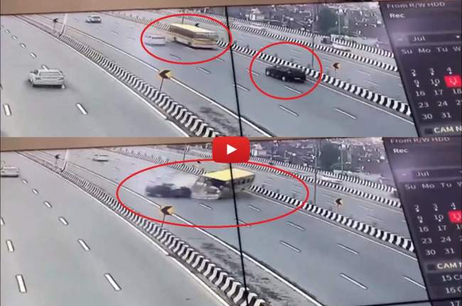 इस हाईवे की निगरानी के लिए लगाए गए सीसीटीवी कैमरों में ये हादसा कैद हो गया है। सीसीटीवी वीडियो में देखा जा सकता है कि बस गलत दिशा में आ रही है। तभी अपनी लेन में चल रही कार बस से टकरा गई। टक्कर के बाद कार के परखच्चे उड़ गए।
