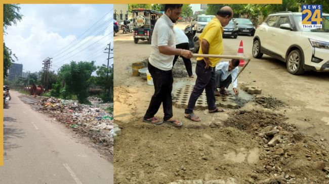 राजनगर एक्सटेंशन में गड्ढा भरते निवासी और सड़क किनारे फैली गंदगी