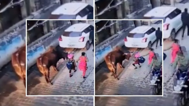 It can be seen in the video that the minor girl is going to school along with another girl when the stray bull which was standing on the side of the road attacked the girl with its horn and injured the child.