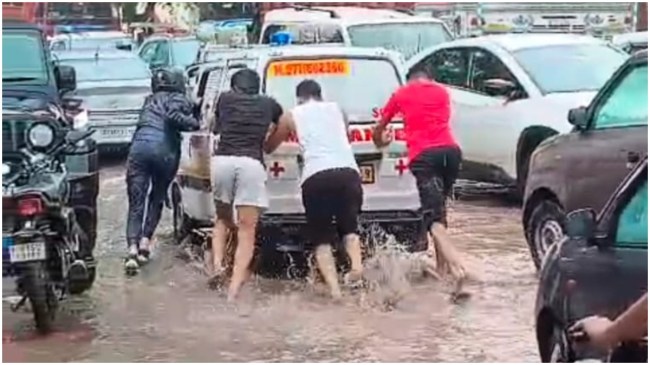 ग्रेटर नोएडा में बारिश के पानी में फंसी एंबुलेंस, धक्का मार रहे लोग