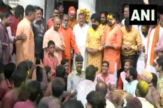 #WATCH | Uttar Pradesh CM Yogi Adityanath participates in #Holi celebrations at Gorakhnath Temple in Gorakhpur. pic.twitter.com/KppGtG2dwn