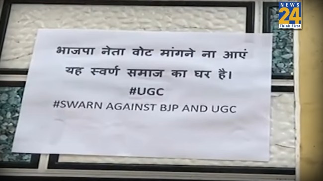 यूजीसी ने नियमों का सबसे ज्यादा विरोध यूपी में देखने को मिल रहा है। लोगों में बीजेपी के खिलाफ साफ गुस्सा देखने को मिल रहा है। यूपी के हापुड़ में सवर्ण समाज के लोगों ने अनोखे तरीके से बीजेपी का विरोध किया है। हापुड़ में घरों के बाहर पोस्टर लगे हैं। पोस्टर में लिखा है कि सवर्ण समाज का घर बीजेपी ना आए। यूजीसी में नए नियम को लेकर सबसे ज्यादा गुस्सा यहां सवर्ण समाज का ही है। लोगों ने साफ तौर पर लिखा है कि भाजपा नेता वोट मांगने ना आए। यह स्वर्ण समाज का घर है।
