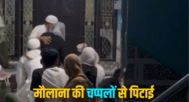 पीड़ित युवती की मां ने मौलाना को चप्पल से पीटा। फोटोः वीडियो ग्रैब @hello73853