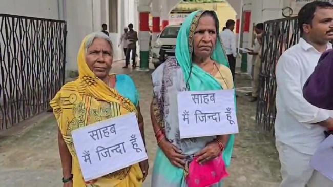 दोनों बुजुर्ग महिलाओं ने समाज कल्याण अधिकारियों को लिखित शिकायत की, लेकिन कोई सुनवाई नहीं हुई। डीएम ने आनन-फानन में समाज कल्याण के अधिकारी नीरज पटेल को फटकार लगाते हुए पेंशन बहाल और जांच करने के आदेश दिए। ये महिलाएं जलालपुर थाना क्षेत्र की केराकत तहसील के बीबन मऊ गांव की रहने वाली हैं। केवला देवी और शांति ने अपने गले में तख्ती लटका ली, जिसमें ‘साहब, मैं जिंदा हूं’ लिखा था।