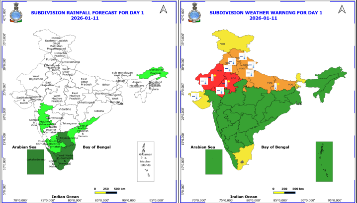 भारतीय मौसम विज्ञान विभाग (IMD) के अनुसार 12 जनवरी 2026 को राजधानी दिल्ली, उत्तर प्रदेश, पंजाब और हरियाणा में ठंड से राहत मिलने के आसार नहीं हैं. मध्य प्रदेश के कई जिलों में हल्की से मध्यम बारिश और ओलावृष्टि की आशंका है. राजस्थान के पूर्वी हिस्सों में गरज के साथ बौछारें पड़ सकती हैं. महाराष्ट्र में विदर्भ और मराठवाड़ा के इलाकों में बिजली गिरने की चेतावनी दी गई है. छत्तीसगढ़ में बादल छाए रहेंगे और कुछ स्थानों पर हल्की बारिश हो सकती है.