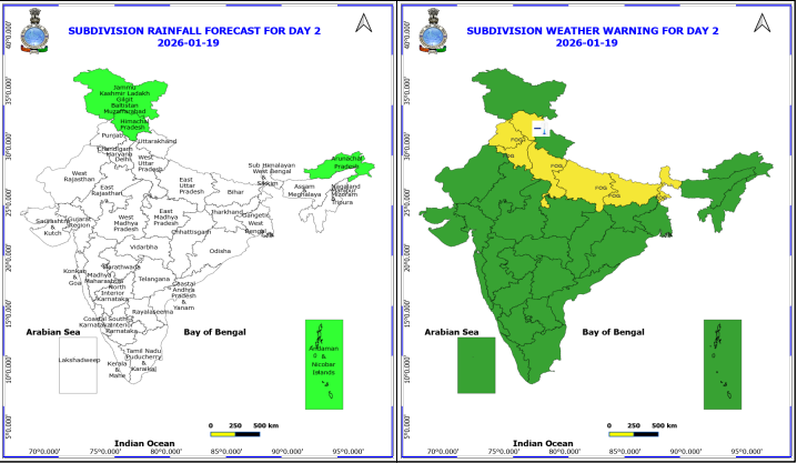 भारतीय मौसम विज्ञान विभाग (IMD) के अनुसार 22 से 24 जनवरी के दौरान काफी बड़े इलाके में बारिश/बर्फबारी होगी, जिसमें 23 जनवरी को कश्मीर, लद्दाख, गिलगित, बाल्टिस्तान, मुजफ्फराबाद और हिमाचल प्रदेश के ऊंचे इलाकों में कुछ जगहों पर भारी बारिश हो सकती है. 18, 21 और 22 जनवरी को उत्तराखंड में भी अलग-अलग जगहों पर हल्की से मध्यम बारिश/बर्फबारी होने की संभावना है और 23-24 जनवरी के दौरान काफी बड़े इलाके में बारिश होगी. 23 और 24 जनवरी को उत्तराखंड में; 22 और 23 जनवरी को पंजाब, हरियाणा, चंडीगढ़, दिल्ली और राजस्थान में गरज के साथ बारिश होने की संभावना है.