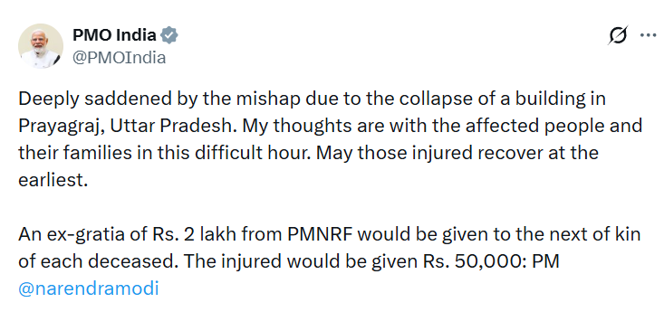 प्रयागराज में मृतकों के लिए पीएम मोदी ने मुआवजे का ऐलान कर दिया है. पीएम मोदी ने कहा, ‘PMNRF से प्रत्येक मृतक के परिजन को 2 लाख रुपये की अनुग्रह राशि दी जाएगी. इसके अलावा घायलों को 50,000 रुपये दिए जाएंगे.’