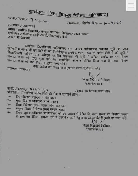 जिला विद्यालय निरीक्षक की तरफ से जारी किए गए पत्र में लिखा है कि जिलाधिकारी ने अपने अधिकारी का प्रयोग करते हुए 28.10.2025 को सार्वजनिक अवकाश का ऐलान किया है. ऐसे में 28 अक्टूबर को जिले के सभी स्कूल बंद रहेंगे.
