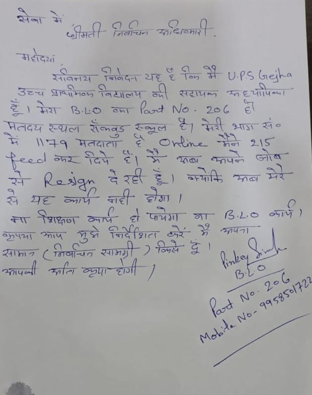 नोएडा के सेक्टर 34 स्थित गेझा के उच्च प्राथमिक स्कूल में सहायक अध्यापिका पिंकी सिंह ने बीएलओ की ड्यूटी से परेशान होकर अपने पद से लिखित में इस्तीफा दे दिया है. उनकी ड्यूटी सेक्टर 33 स्थित राकवुड स्कूल में मतदान केंद्र की बीएलओ की जिम्मेदारी संभालने लगाई गई थी.