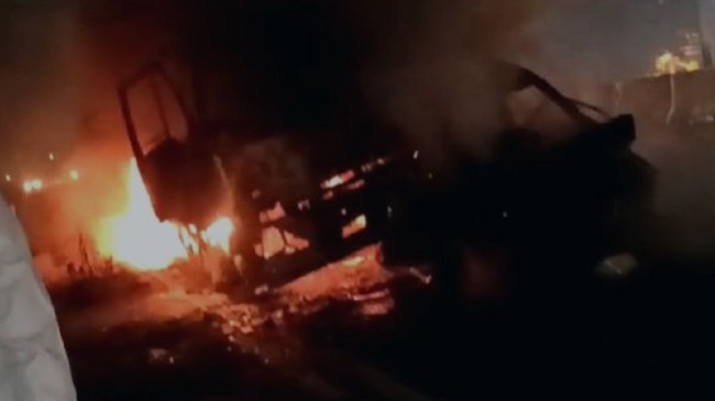 VIDEO | Uttar Pradesh: Four people, including a groom, were burnt alive after the car they were travelling in caught fire following collision with a truck on Jhansi-Kanpur highway late last night.