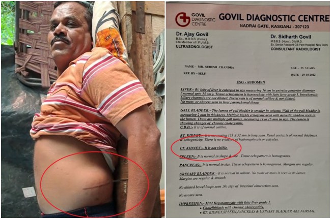मामला कासगंज जिले का है। यहां रहने वाले सुरेश चंद्र होमगार्ड के जवान हैं। वर्तमान में उनकी तैनाती कासगंज सीडीओ आवास पर है। उन्होंने बताया कि इसी साल 12 अप्रैल को उन्हें किडनी में दर्द की शिकायत हुई। डॉक्टर को दिखाया तो उन्होंने बताया कि किडनी में स्टोन है। इसके बाद सुरेश अलीगढ़ जिले के एक निजी अस्पताल में गए। वहां डॉक्टरों ने ऑपरेशन कर दिया। कहा कि किडनी में से स्टोन निकाल दिया है।