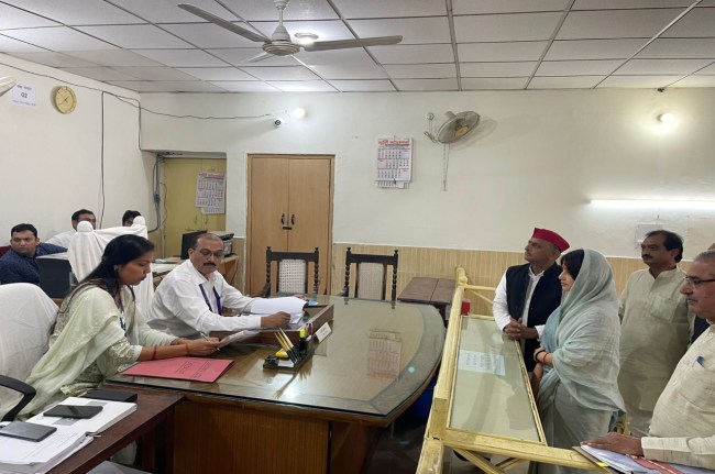 Samajwadi Party leader Dimple Yadav filed her nomination for the Mainpuri Assembly by-election today. Party chief Akhilesh Yadav was also with her.