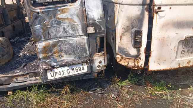 फायर ब्रिगेड की देरी से एम्बुलेंस जलकर हुई राख