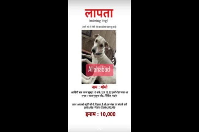मीडिया रिपोर्ट्स के मुताबिक प्रयागराज के नवाब यूसुफ रोड स्थित सिविल लाइंस की रहने वाली सुयुक्ति सेठ का देसी नस्ल का पालतू कुत्ता ‘मोमो’ 25 दिसंबर से लापता है। उन्होंने बताया कि अगर कोई उसे खोजकर लाता है तो वह उसे ₹10,000 का इनाम देंगी। इसके लिए सुयुक्ति ने सोशल मीडिया समेत अपने घर के आसपास मोमो की फोटो के साथ पोस्टर चिपकाए हैं। साथ ही अपील करते हुए फोन भी दिए हैं।