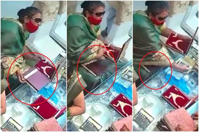 सीसीटीवी फुटेज को गौर से देखने पर पता चलता है कि महिला पहले हार के एक डिब्बे को उठाती है। उसे रख देती है। इसके बाद दूसरे हार का डिब्बा उठाती है। उसे भी देखती है। फिर महिला दूसरे डिब्बे को पहले डिब्बे के ऊपर रखती है और चतुराई से दोनों डिब्बों को अपनी गोद में रखती है। दुकान पर खड़े दो लोगों से कुछ बातें करती है। देखते ही देखते नीचे वाले डिब्बे को अपनी साड़ी में छिपा लेती है।