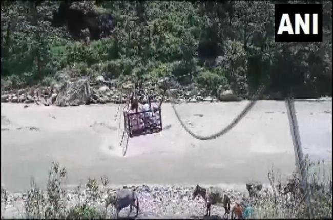#WATCH | Uttarakhand | Villagers of Syuna Village under Bhatwadi block of Uttarkashi district risk their lives to cross a raging Bhagirathi river as they cross it in a trolley, due to a lack of roads and bridges. This trolley is installed near Gangori, adjacent to Gangotri… pic.twitter.com/L4gak4Ec2p
