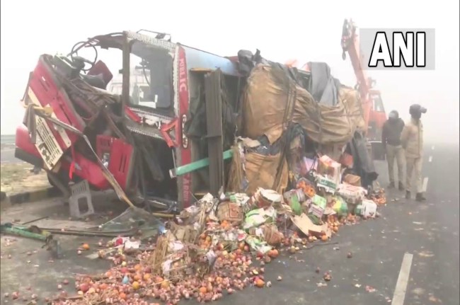 Uttar Pradesh | Several vehicles piled up while buses and loaded trucks overturned on a highway in Gorakhpur due to the prevailing dense fog. pic.twitter.com/1WU0phizwz
