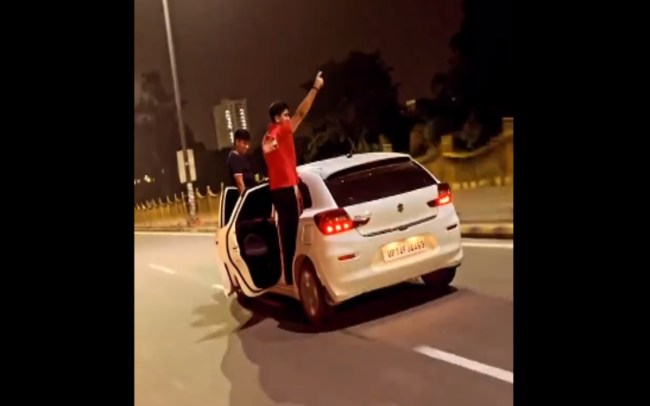 वीडियो में देखा जा सकता है कि एक सफेद रंग की कार रोड पर तेज रफ्तार में दौड़ रही है। इसी दौरान ड्राइवर के दूसरी साइड वाली खिड़कियों को खोल कर दो युवक स्टंट करते हुए दिखाई दिए।