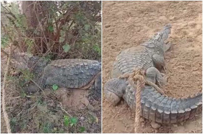 मामला कासगंज जिले के कोतवाली ढोलना क्षेत्र के नगला बसु गांव का है। यहां दोपहर को खेतों में एक मगरमच्छ मिलने से ग्रामीणों में पहले तो हड़कंप मच गया। फिर बाद में यही मगरमच्छ कौतूहल का विषय बन गया। इसे देखने के लिए सैकड़ों की संख्या में ग्रामीण खेतों पर पहुंच गए। इसी दौरान गांव के कुछ लोगों ने रस्सों से उसे बांध लिया।