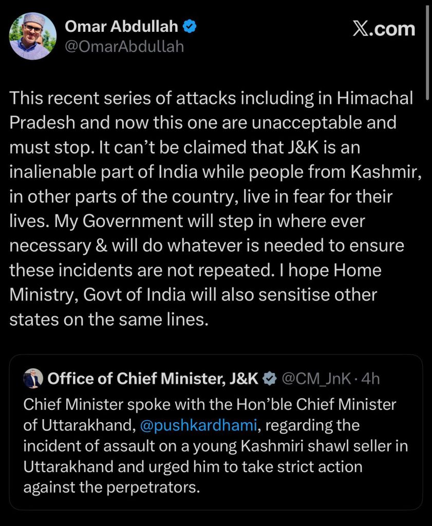 जम्मू-कश्मीर के मुख्यमंत्री उमर अब्दुल्ला ने भी इस हमले की निंदा करते हुए एक्स पर ऐसी घटनाओं को ‘अस्वीकार्य’ बताया. उन्होंने कहा, ‘एक तरफ हम कहते हैं कि जम्मू-कश्मीर भारत का अभिन्न हिस्सा है, वहीं दूसरी तरफ कश्मीर के लोगों को डर के माहौल में जीने पर मजबूर किया जा रहा है… मेरी सरकार जहां भी ज़रूरी होगा, दखल देगी.’ अब्दुल्ला ने गृह मंत्रालय से अपील की कि वह अन्य राज्यों को जम्मू-कश्मीर के निवासियों की सुरक्षा और सम्मान को लेकर संवेदनशील बनाए.