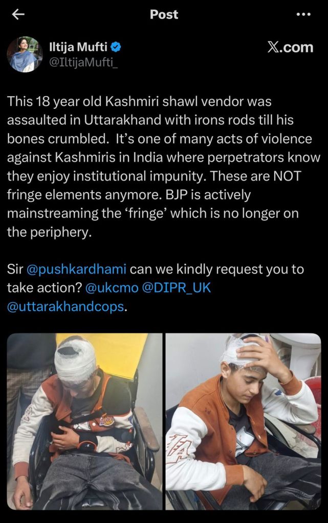 राजनीतिक दलों और छात्र संगठनों ने इस हमले की कड़ी निंदा की और मामले की गहन जांच की मांग उठाई. पीडीपी नेता इल्तिजा मुफ्ती ने एक्स (पूर्व ट्विटर) पर लिखा, ‘इस 18 साल के कश्मीरी शॉल विक्रेता को उत्तराखंड में लोहे की रॉड से तब तक मारा गया जब तक उसकी हड्डियां टूट नहीं गईं. यह कश्मीरियों के खिलाफ हिंसा की उन कई घटनाओं में से एक है, जहां हमलावर जानते हैं कि उन्हें संस्थागत छूट मिली हुई है. ये अब ‘फ्रिंज’ नहीं रहे. बीजेपी ही ‘फ्रिंज’ को मेनस्ट्रीम बना रही है… माननीय पुष्कर धामी साहब, क्या हम आपसे कार्रवाई की गुजारिश कर सकते हैं?’