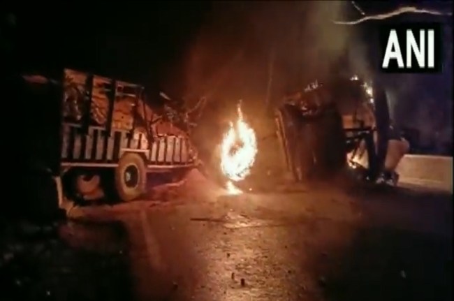 #WATCH Uttar Pradesh: A collision took place between a tank filled with ethanol and a tractor trolley took place in Sitapur after which the tanker caught fire due. Police teams have reached the spot. pic.twitter.com/io1ws7i0Pp