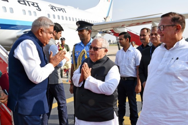 जयपुर: भारत के उपराष्ट्रपति जगदीप धनकड़ आज वायुसेना के विमान से गुलाबी नगरी पहुंचे हैं। जयपुर एयरपोर्ट पहुंचने पर जगदीप धनकड़ का गवर्नर कलराज मिश्र ने स्वागत किया।
