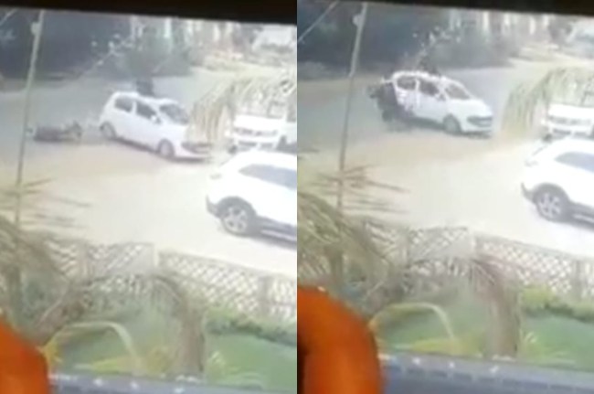 рд╣рд╛рджрд╕реЗ рдореЗрдВ рджреЛрдиреЛрдВ рд╡рд╛рд╣рди рдХреНрд╖рддрд┐рдЧреНрд░рд╕реНрдд рд╣реБрдП рд╣реИрдВред рдмрд╛рдЗрдХ рдЪрд╛рд▓рдХ рдХреЛ рдорд╛рдореВрд▓реА рдЦрд░реЛрдВрдЪреЗрдВ рд▓рдЧреА рд╣реИред рд╡реАрдбрд┐рдпреЛ рдореЗрдВ рдПрдХ рд╕рдлреЗрдж рд░рдВрдЧ рдХреА рдХрд╛рд░ рд╕рдбрд╝рдХ рдкрд░ рдЬрд╛рддреА рджрд┐рдЦ рд░рд╣реА рд╣реИред рдЕрдЪрд╛рдирдХ рд╡рд╣ рд░реБрдХ рдЬрд╛рддреА рд╣реИ рдФрд░ рдлрд┐рд░ рджрд╛рдПрдВ рдУрд░ рдореБрдбрд╝рдиреЗ рд▓рдЧрддреА рд╣реИред рдЕрднреА рдХрд╛рд░ рдкреВрд░реА рддрд░рд╣ рдореБрдбрд╝реА рднреА рдирд╣реАрдВ рдереА рдХрд┐ рдкреАрдЫреЗ рд╕реЗ рдПрдХ рдмрд╛рдЗрдХ рддреЗрдЬ рд░рдлреНрддрд╛рд░ рдореЗрдВ рдЖрдИ рдФрд░ рдХрд╛рд░ рдХреЗ рдЪрд╛рд▓рдХ рд╕реАрдЯ рдХреА рддрд░рдл рдЬреЛрд░рджрд╛рд░ рдЯрдХреНрдХрд░ рдорд╛рд░ рджреАред рдЯрдХреНрдХрд░ рдЗрддрдирд╛ рддреЗрдЬ рдереА рдмрд╛рдЗрдХ рд╕рд╡рд╛рд░ рдЙрдЫрд▓рдХрд░ рдХрд╛рд░ рдХреА рдЫрдд рдкрд░ рдЬрд╛ рдЧрд┐рд░рд╛ред