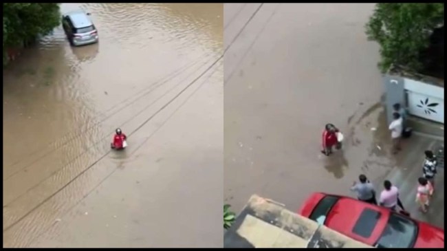 एक वायरल वीडियो में दिखाया गया है कि Zomato का डिलीवरी एजेंट मोटरसाइकिल पर बैठा है और गहरे बाढ़ के पानी में रास्ता बनाते हुए चल रहा है। पानी की गहराई उसकी बाइक के पैरों तक पहुच गई है, लेकिन उसने अपने कर्तव्य को पूरा करने की ठान ली है।