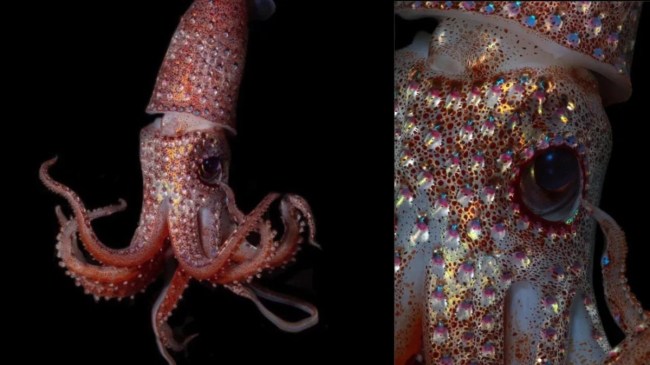 वैज्ञानिकों ने इस जीव को कॉकआईड स्क्विड (Cockeyed Squid) नाम दिया है। वैज्ञानिकों को ये जीव समुद्र तल में सतह से 1,000 मीटर की गहराई चलता हुआ मिला। कॉकआईड स्क्विड की ये रोचक तस्वीरें इंस्टाग्राम पर @venueearth नाम की आईडी से शेयर की गई है। इस तस्वीर को देखने के बाद लोग काफी कमेंट कर रहे हैं और प्राकृतिक सुंदरता को इससे जोड़ रहे हैं।