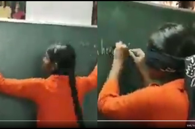 इंटरनेट पर यह वीडियो जमकर वायरल हो रहा है। अभी तक इस वीडियो के कुल करीब 944.4K View हो चुके हैं। वीडियो में युवती किसी क्लास में ब्लैक बोर्ड के आगे खड़ी दिख रही है। वह देखने में टीचर लग रही है। वह पहले अपने दोनों हाथों से एक साथ इंग्लिश में लिखती है। फिर उसकी आंख पर कोई शख्स कपड़े की पट्टी बांध देता है। वह इसके बावजूद भी ब्लैक बोर्ड पर बड़ी आसानी से लिखती हुई दिखाई पड़ रही है।