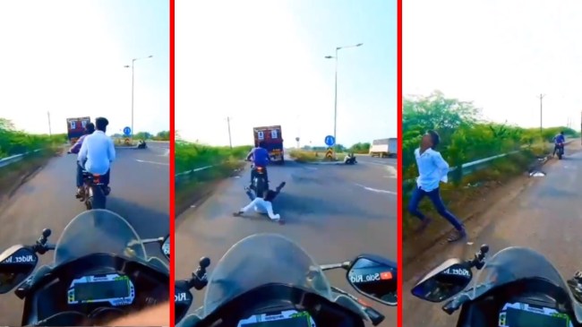 рд╡рд╛рдпрд░рд▓ рд╡реАрдбрд┐рдпреЛ рдореЗрдВ рджреЗрдЦрд╛ рдЬрд╛ рд╕рдХрддрд╛ рд╣реИ рдХрд┐ рджреЛ рдмрд╛рдЗрдХ рд╕рд╡рд╛рд░ рдПрдХ рдЯреНрд░рдХ рдХреЗ рдкреАрдЫреЗ рдЪрд▓ рд░рд╣реЗ рд╣реИрдВред рдЗрдирдореЗрдВ рд╕реЗ рдПрдХ рдмрд╛рдЗрдХ рдкреАрдЫреЗ рд╣реИрдВ рдЬрд┐рд╕рдХреЗ рд╣реЗрд▓рдореЗрдЯ рдореЗрдВ рдХреИрдорд░рд╛ рд▓рдЧрд╛ рд╣реБрдЖ рд╣реИ рдЬрдмрдХрд┐ рдЖрдЧреЗ рдЪрд▓ рд░рд╣реА рдмрд╛рдЗрдХ рдкрд░ рджреЛ рд▓реЛрдЧ рдмреИрдареЗ рд╣реБрдП рд╣реИрдВ рдФрд░ рджреЛрдиреЛрдВ рд╣реА рдмрд┐рдирд╛ рд╣реЗрд▓рдореЗрдЯ рдХреЗ рд╣реИрдВред рдЗрд╕реА рджреМрд░рд╛рди рдмрд╛рдЗрдХ рдЪрд▓рд╛ рд░рд╣рд╛ рд╢рдЦреНрд╕ рд╕реНрдЯрдВрдЯ рдХрд░рдиреЗ рд▓рдЧрддрд╛ рд╣реИ рдФрд░ рдЕрдЪрд╛рдирдХ рдПрдХреНрд╕реАрд▓реЗрдЯрд░ рдмреЭрд╛ рджреЗрддрд╛ рд╣реИред