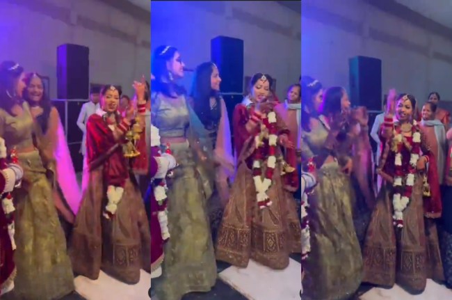 Viral Video में दुल्हन की पांच-छह बहनें उसे आकर घेर लेती हैं। अपने जीजा जी के सामने वह अपनी बहना से गाने के बोल पर चुटकी लेते हुए डांस करते हुए पूछती हैं। दुल्हन भी कुछ कम नहीं, जैसे ही गाने के बोल आगे बढ़े उसने भी हाथ उठाकर कमर लचकाना शुरू कर दिया। दोनों हाथ ऊपर उठाए दुल्हन अपना चूड़ा दिखाते हुए बड़ा सुंदर डांस करती दिख रही है।