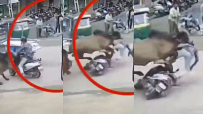 рд╡реАрдбрд┐рдпреЛ рдореЗрдВ рджрд┐рдЦрд╛рдИ рджреЗ рд░рд╣рд╛ рд╣реИ рдХрд┐ рджреЛ рд╕рд╛рдВрдбреЛрдВ рдХреЗ рдмреАрдЪ рд▓реЬрд╛рдИ рдЪрд▓ рд░рд╣реА рдереАред рдЬрдм рдПрдХ рд╕рд╛рдВрдб рднрд╛рдЧрдиреЗ рд▓рдЧрд╛ рддреЛ рдЙрд╕рдХреЗ рд╕рд╛рдордиреЗ рд╕реНрдХреВрдЯреА рд╕рд╡рд╛рд░ рд╢рдЦреНрд╕ рдкрд╣реБрдВрдЪ рдЧрдпрд╛ред рд╕рд╛рдВрдб рдиреЗ рдЗрддрдиреА рдЬреЛрд░ рд╕реЗ рдЯрдХреНрдХрд░ рдорд╛рд░реА рдХрд┐ рд╕реНрдХреВрдЯреА рд╕рд╡рд╛рд░ рд╢рдЦреНрд╕ рджреВрд░ рдЬрд╛рдХрд░ рдЧрд┐рд░рд╛ред рдЗрд╕ рдШрдЯрдирд╛ рдХрд╛ рд╡реАрдбрд┐рдпреЛ рд╡рд╛рдпрд░рд▓ рд╣реЛ рд░рд╣рд╛ рд╣реИ, рдЬреЛ рд╕реАрд╕реАрдЯреАрд╡реА рдореЗрдВ рдХреИрдж рд╣реЛ рдЧрдпрд╛ред
