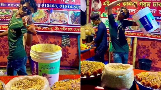 वीडियो में आप देख सकते हैं कि हरी टी शर्ट, ब्लू जीन्स और ब्लैक चश्मे में एक शख्स भेलपूरी बनाते दिख रहा है। हालांकि दुकान में और लोग भी काम करते दिख रहे हैं। लेकिन शख्स अनोखे अंदाज में भेलपूरी बना रहा है। शख्स ने पहले एक बड़ी साइज की बाल्टी ली और उसमें अलग- अलग तरह के सामग्रियों और मसालों को डालकर मिक्स किया। भेलपूरी वाले के इस अंदाज को वहां खड़े कुछ बच्चे भी देख रहे हैं। वीडियो बांग्लादेश का बताया जा रहा है, जो लोगों को खूब पसंद आ रहा है।