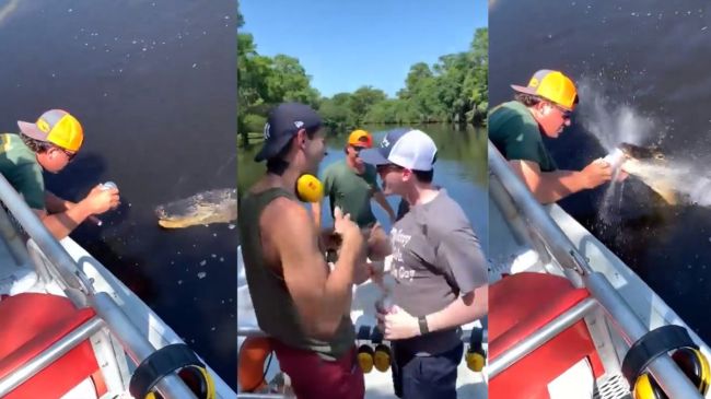 Florida man uses a gator to open a beer can.