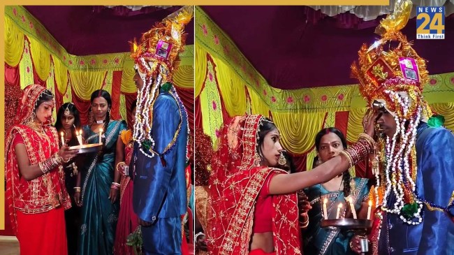 आमतौर पर दुल्हनें थाली में दीया, चावल और रोली रखकर दूल्हे की आरती उतारती हैं, लेकिन इस वायरल वीडियो में थाल में दिया की जगह सफेद मोमबत्तियां जली हुई थीं और बीच में एक अगरबत्ती लगी हुई थी. इसे देखकर वहां मौजूद लोग और वीडियो देखने वाले सोशल मीडिया यूजर्स खूब हंस पड़े. इस अनोखे सेटअप ने पूरे माहौल को मजेदार बना दिया.