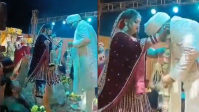 वीडियो में देखा जा सकता है कि एक दूल्हा और दुल्हन का जोड़ा स्टेज पर खड़ा हुआ है। दोनों के हाथ में मालाएं हैं। इससे अंदाजा लगाना आसान है कि यह जयमाल के दौरान का दृश्य है। सबकी निगाहें दोनों पर थीं साथ ही कई कैमरे फोटो ले रहे थे। इसी बीच हाथ में माला लिए खड़ी दुल्हन ने दूल्हे को ऊंगली से नीचे की ओर इशारा किया।