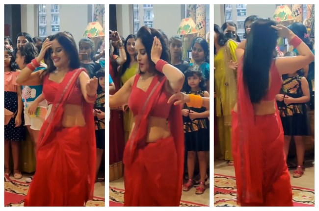 इस Viral video में किसी शादी समारोह का सीन नजर आ रहा है। कुछ लड़कियां अपना डांस परफॉर्मेंस देने आती हैं। सबने अलग-अलग रंग लाल, पीली आदि रंग की साड़ियां पहन रखी हैं। इनमें से लाल साड़ी पहनी एक लड़की ने जब कमर हिलाना शुरू किया तो मानों नोरा फतेही nora fatehi भी उसके सामने फेल हो गई। वह लड़की यहीं नहीं रुकी उसने बैकग्राउंड में बजते बॉलीवुड सॉन्ग पर गजब का डांस किया। उसके एक्सप्रेशन भी कमाल के थे।