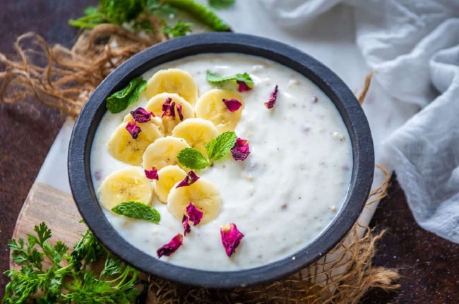 अब आपका स्वादिष्ट केले का मीठा रायता बनकर तैयार हो चुका है।