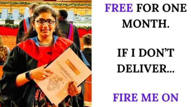 इसके साथ ही लड़की ने एक फोटो शेयर की है, जिसमें लिखा है कि मुझे एक महीने के लिए फ्री में नौकरी पर रखें। अगर मैं ठीक से काम ना करूं तो नौकरी से निकाल देना। मैं कोई सवाल नहीं पूछूंगी। सोशल मीडिया पर स्वेता का यह पोस्ट वायरल हो रहा है और इस पर बड़ी संख्या में लोगों की प्रतिक्रियाएं आ रही हैं।