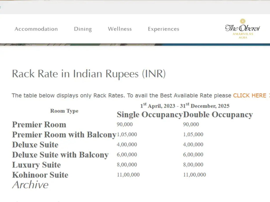 рдЖрдЧрд░ рдХреЗ рдЕрдорд░ рд╡рд┐рд▓рд╛рд╕ рд╣реЛрдЯрд▓ рдХрд╛ рдХреЛрд╣рд┐рдиреВрд░ рд╕реБрдЗрдЯ рдЗрд╕ рд╣реЛрдЯрд▓ рдХрд╛ рд╕рдмрд╕реЗ рдорд╣рдВрдЧрд╛ рдХрдорд░рд╛ рд╣реИ. рд╣реЛрдЯрд▓ рдХреА рд╡реЗрдмрд╕рд╛рдЗрдЯ www.oberoihotels.com рдХреЗ рдЕрдиреБрд╕рд╛рд░, рдХреЛрд╣рд┐рдиреВрд░ рд╕реБрдЗрдЯ рдХрд╛ рдПрдХ рд░рд╛рдд рдХрд╛ рдХрд┐рд░рд╛рдпрд╛ 1100000 рд░реБрдкрдпреЗ рд╣реИ.