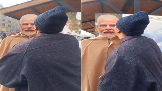 Man Kissing PM Modi Life Size Cutout At Srinagar: कश्मीर के घंटाघर से एक दिल छू जाने वाला वीडियो सामने आया है। ये वीडियो सोशल मीडिया पर तेजी से वायरल हो रहा है। बताया जा रहा है कि ये वीडियो घंटाघर में आयोजित International Pheran Day 2023 के कार्यक्रम का है। वीडियो में एक कश्मीरी व्यक्ति पीएम नरेंद्र मोदी के कटआउट स्टैच्यू पर प्यार बरसाते दिखाई दे रहा है। पीएम नरेंद्र मोदी के कटआउट के साथ कश्मीरी व्यक्ति का ये प्यार यहीं नहीं थमा, उसने पहले तो पीएम मोदी के कटआउट को प्यार से सहलाया और उसे 2 बार किस किया। इसके बाद फिर पीएम मोदी के कटआउट के गले लगा। इस दौरान कश्मीरी व्यक्ति काफी इमोशनल दिखाई दिया।