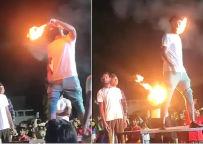 थोड़ी देर बाद स्टंट दिखा रहे शख्स ने आग लगी हुई छड़ी को अपने मुंह के पास रखा और उसमें पेट्रोल डाला। इसके कुछ ही सेकेंड बाद उनकी दाढ़ी में आग लग गई। अन्य लोग उसकी मदद के लिए दौड़े और आग बुझाने के लिए जोर-जोर से उसके चेहरे को थपथपाया।