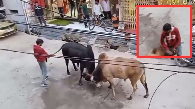 Bull Fight Viral Video:┬ард╕реЛрд╢рд▓ рдореАрдбрд┐рдпрд╛ рдкрд░ рдПрдХ рд╡реАрдбрд┐рдпреЛ рд╡рд╛рдпрд░рд▓ рд╣реЛ рд░рд╣рд╛ рд╣реИ, рдЬрд┐рд╕рдореЗрдВ рдПрдХ рд╢рдЦреНрд╕ рд╕рд╛рдВрдб рдХреА рд▓реЬрд╛рдИ рдЫреБреЬрд╛рдиреЗ рдкрд╣реБрдВрдЪрд╛ рдерд╛ред рд╕рд╛рдВрдб рдиреЗ рдЗрд╕ рд╢рдЦреНрд╕ рдХреЛ рдРрд╕рд╛ рд╕рдмрдХ рд╕рд┐рдЦрд╛рдпрд╛ рд╣реИ рдХрд┐ рдЬрд┐рдВрджрдЧреА рдореЗрдВ рдЗрд╕реЗ рд╕рд╛рдВрдб рдХреЗ рдирд╛рдо рд╕реЗ рднреА рдбрд░ рд▓рдЧреЗрдЧрд╛ред рджреЛ рд╕рд╛рдВрдбреЛрдВ рдХреА рд▓реЬрд╛рдИ рдЫреБреЬрд╛рдиреЗ рдкрд╣реБрдВрдЪреЗ рдЗрд╕ рд╢рдЦреНрд╕ рдХреЗ рд╣рд╛рде рдореЗрдВ рдирд╛ рддреЛ рдбрдВрдбрд╛ рдерд╛ рдФрд░ рдирд╛ рдХреЛрдИ рдФрд░ рдЪреАрдЬ, рдКрдкрд░ рд╕реЗ рд▓рд╛рд▓ рдХрдкреЬрд╛ рдкрд╣рдирд╛ рд╣реБрдЖ рдерд╛ред