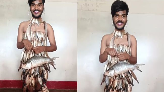 सोशल मीडिया पर अपने अजीबोगरीब फैशन के कारण फेमस नेनवथ थारुन एक इन्फ्लुएंसर है, जिन्होंने हाल ही में एक रील शेयर की है, जिसमें पूरी तरह से मछली से बनी एक यूनिक ‘ड्रेस’ पहनी है, बता दें कि ये असली मछलियां है। वीडियो में थारुन को दर्जनों मछलियां को पहने हुए देखा जा सकता है, जो ड्रेस जैसी दिखती हैं। ये वीडियो तेजी से इंटरनेट पर वायरल हो रहा है।